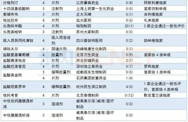 氟伐他汀鈉緩釋片(北京世橋生物制藥)、琥珀酰明膠電解質注射液(貝朗醫(yī)療)、氫溴酸伏硫西汀片(揚子江藥業(yè)集團)、曲前列尼爾注射液(兆科藥業(yè))、十四烷基硫酸鈉注射液(上海上藥第一生化藥業(yè))等5個品種均為首仿申請,其他情況請見下表。